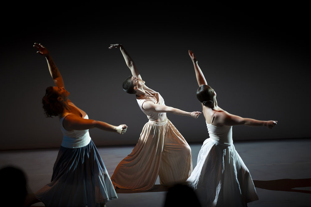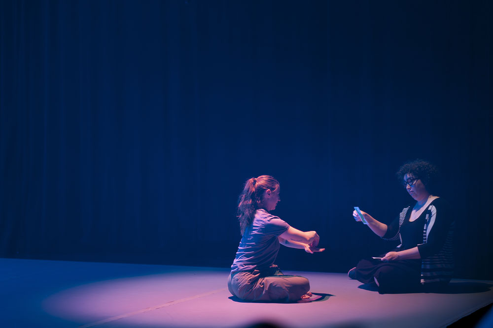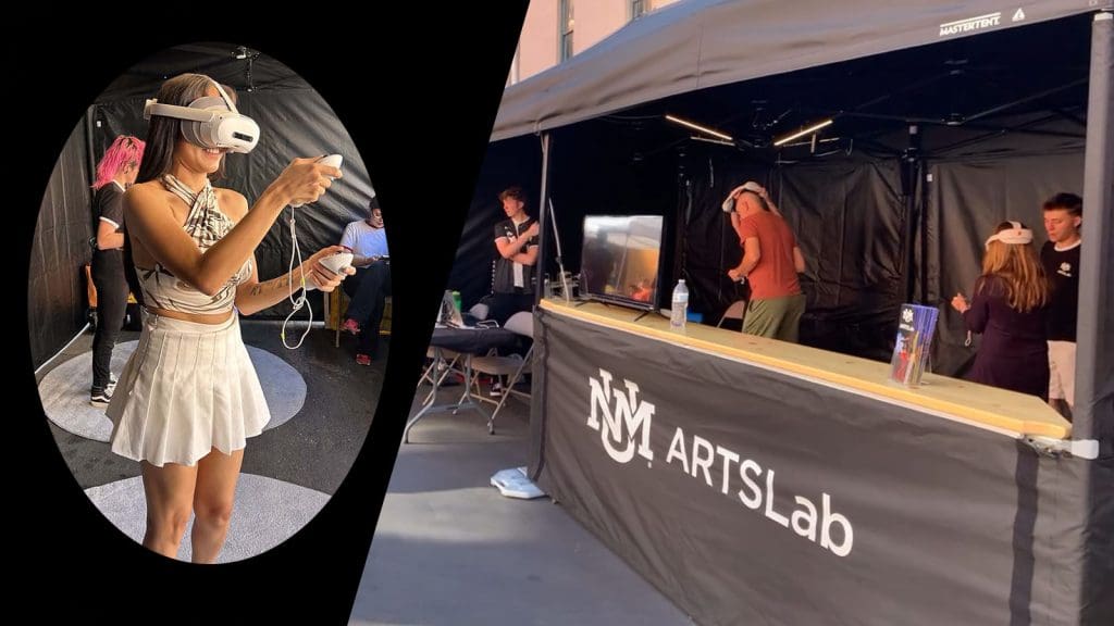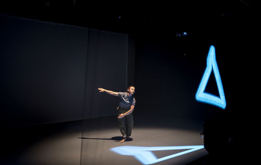 UNM Adjunct Eden Radfarr created a work that explores absence, black holes, and the potential that is present in the darkness and space in our lives. She worked with Amy Taylor on visuals, Blayne Greiner created sound for the piece, and Madrone Matysiak developed choreography for the three dancers: Lara Segura, Laura Orozco Garrett, and Elyse Fahey. Lead Program coordinators Sarah Bennett-Davidson and Madrone Matysiak also collaborated on a work together, back and forth, which explored how we can build systems of understanding and communication between entities that have no prior knowledge or understanding of the other. Kevin Paul contributed live sound to the piece. ARTSLab director Stewart Skylar Copeland worked with two local dancers Amanda Hamp and Bobcat Ranf to develop a work that is both humorous and sincere and incorporates 360 camera video as well as live point cloud footage. The trio plans on expanding the work in the future.